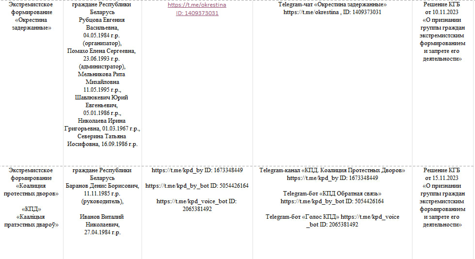 КГБ признал «экстремистскими формированиями» телеграм-чат «Окрестина задержанные» и телеграм-канал «Коалиция протестных дворов», следует из обновленного перечня ведомства.